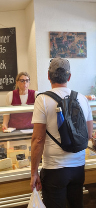 Saindo do parque do leão, estávamos cansados e com fome. Ali perto ficava um lugarzinho que eu tinha visto no YouTube, no canal Aplins in the Alps: a Chäs Barmettler, uma lojinha fofa de queijos e produtos típicos, administrada há décadas pela mesma família. A fachada convida a entrar, mas o cheirinho das tortinhas de queijo assando em um forninho na porta é simplesmente irresistível. Fomos recebidos pelas simpáticas senhorinhas proprietárias, que não falam inglês.
