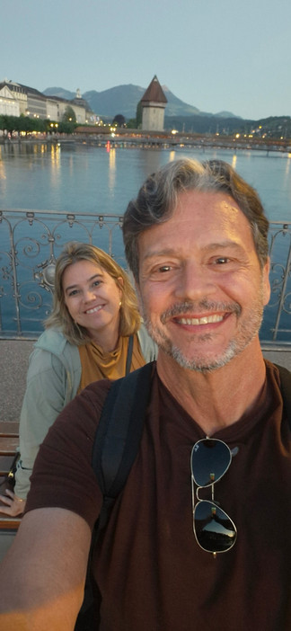 Chegamos mais uma vez na Kapellbrücke, com suas luzes refletidas no Reuss como lanternas flutuantes. Atravessar a ponte à noite foi um dos momentos mais mágicos da viagem: a madeira antiga rangia sob os pés, a torre se projetava na água e a cidade parecia estar ali só pra gente.