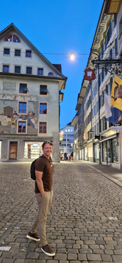 Depois desse "déjà vou", partimos para explorar a cidade. Nossa primeira parada foi a deslumbrante Jesuitenkirche, um dos edifícios mais emblemáticos do centro histórico. Construída no Século XVII, é a primeira grande igreja barroca da Suíça, e impressiona tanto por fora, com sua fachada branca e torres arredondadas, quanto por dentro, com um interior luminoso e ricamente decorado. Com colunas elegantes e afrescos no teto, é um espaço que inspira reverência e deslumbre.