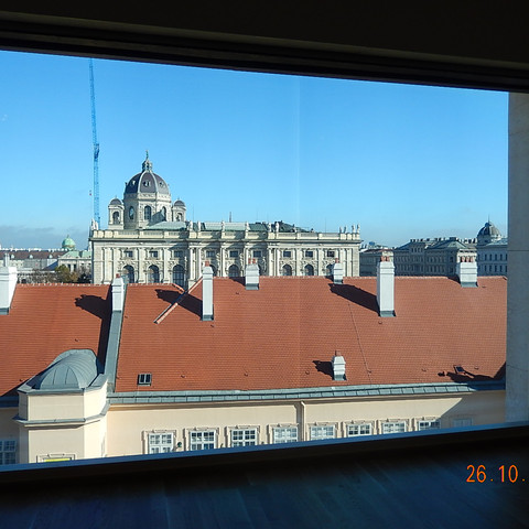 Do segundo andar do Museu Leopold tem uns janelões fantásticos que dão para a praça. Adoramos a vista!